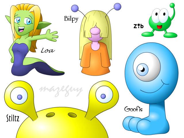Besides the characters in my own cartoons and games, I've designed colorful mascots for several websites.